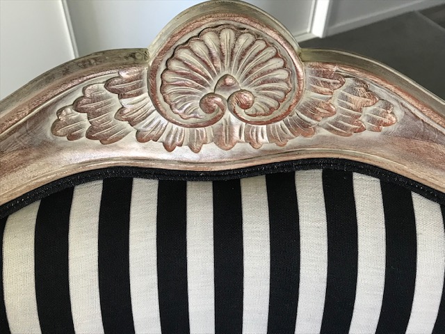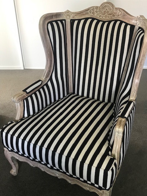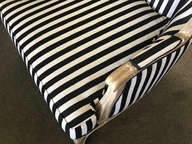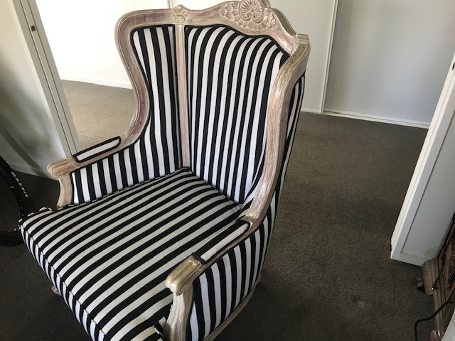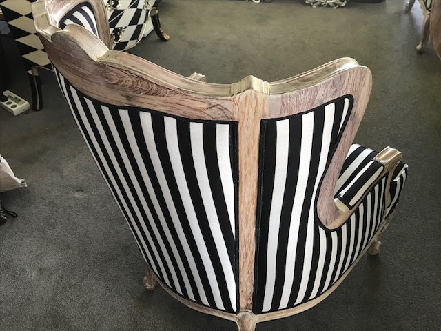 French wing chair in solid mahogany and whitewash antique distressed finish -black /white fabric